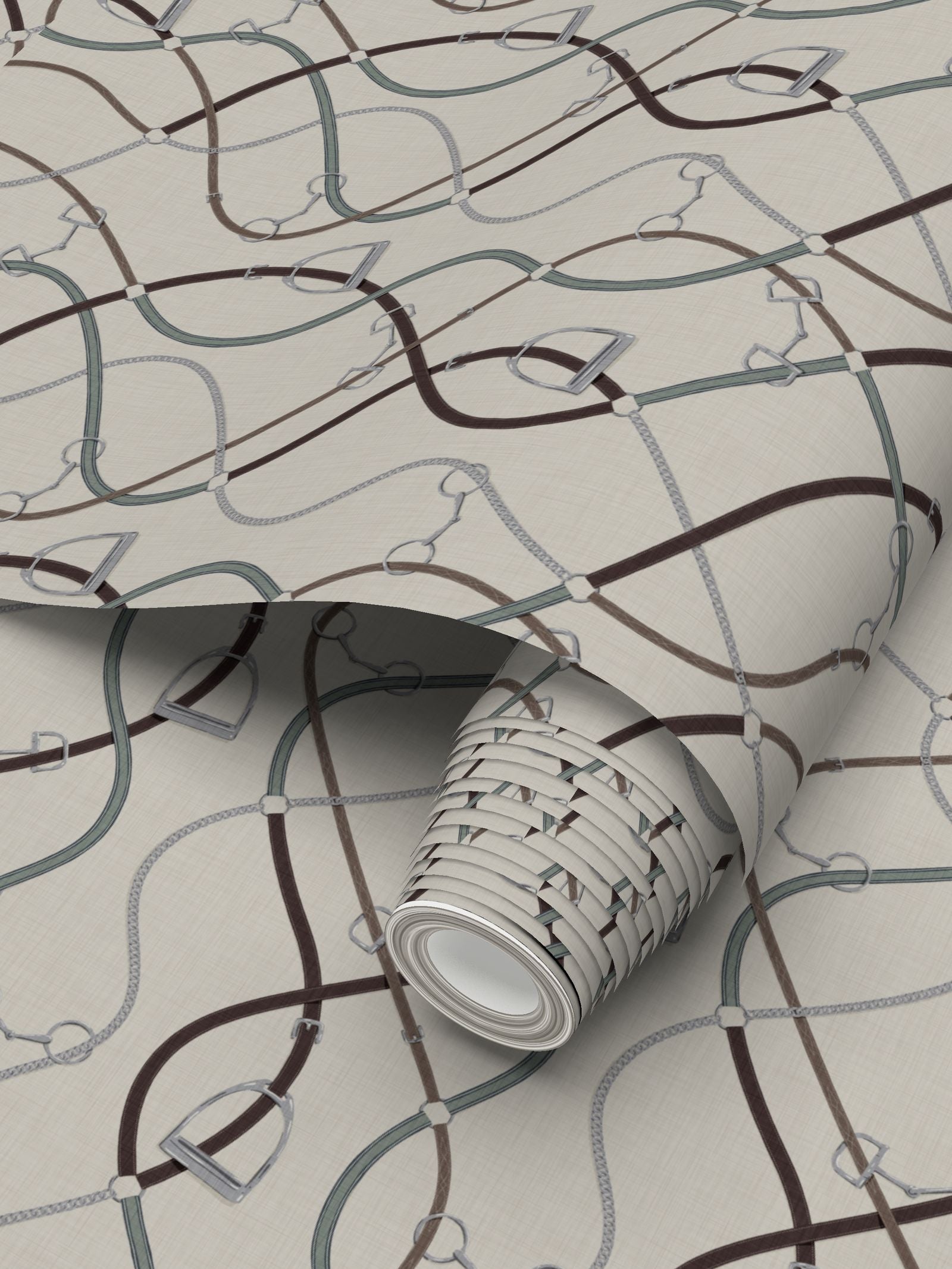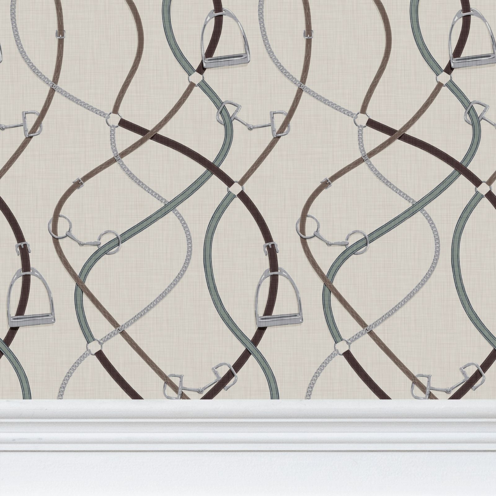 Achieve English country club chic with Foxcroft, a tailored pattern of entwined bits, stirrups, reins, and leathers—drawn from haute couture and timeless equestrian tradition. This design brings a sense of horse-country heritage to interiors, with vintage-leaning, dramatic palettes that feel right at home in a moody study, a paneled library, or even a bold half bath.