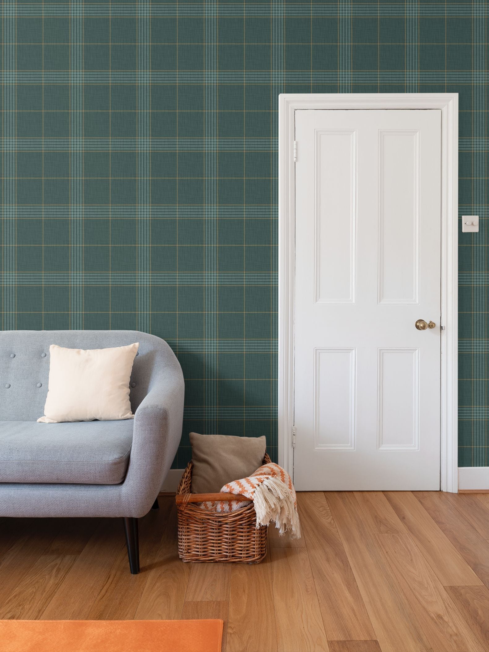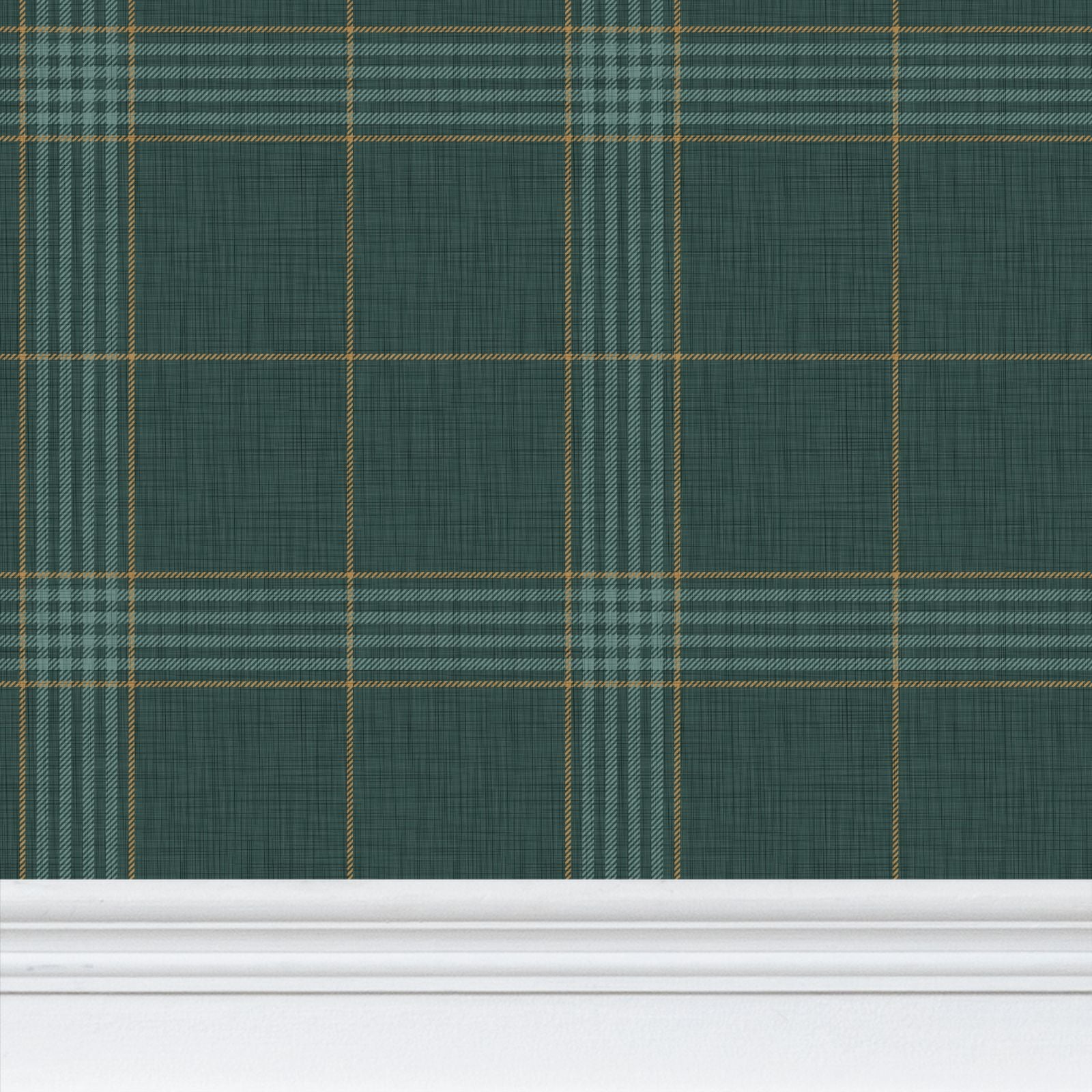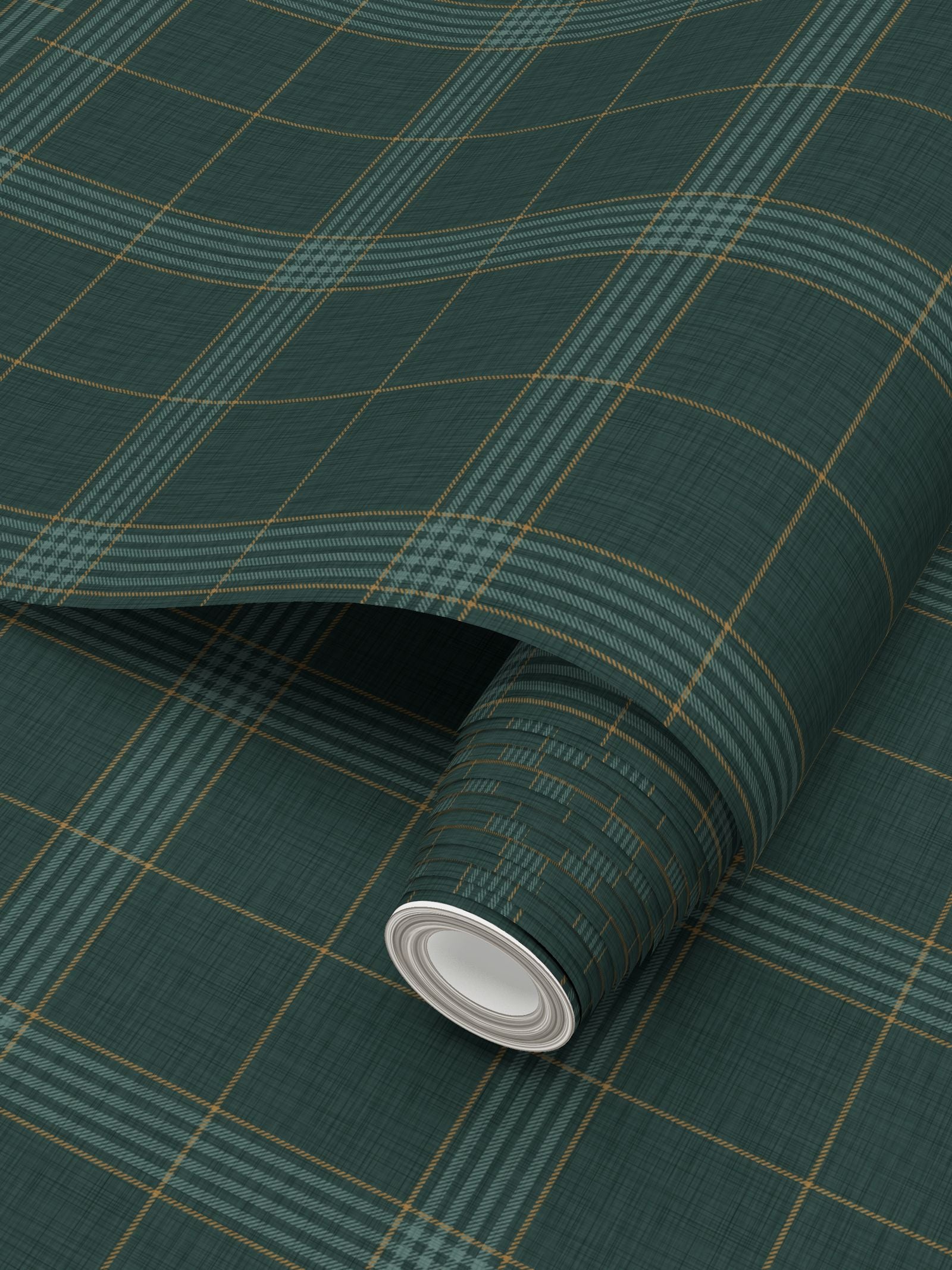 Hollis tartan wallpaper is a printed design that captures the warmth and familiarity of a traditional woven plaid. Its soft, textural effect adds depth to the walls while keeping the look tailored and timeless. A natural fit for country houses, equestrian interiors, and cottage settings, Hollis brings a quiet sense of heritage and comfort to classic spaces. The Juniper colorway is a rich combination of hunter green, gold, and cream. Pair with dark woods and bright metals for a beautiful interior.